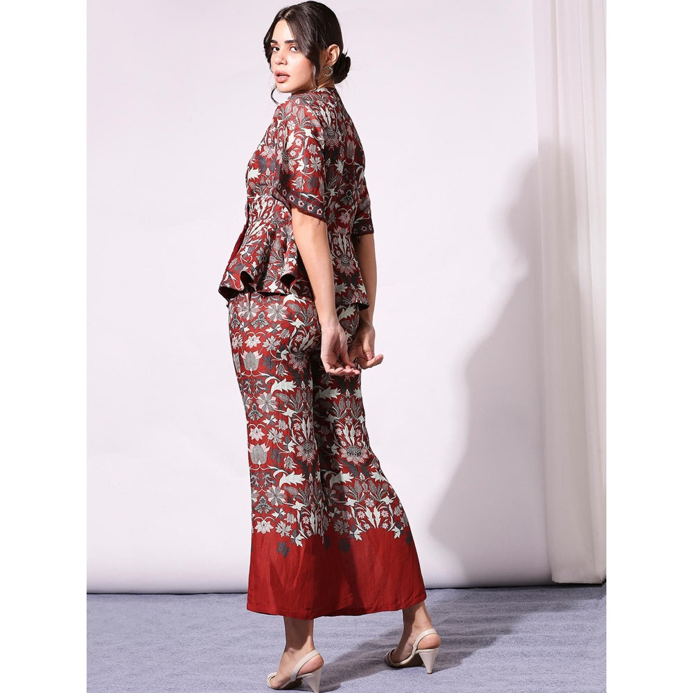Description : Printed overlap peplum top paired wth sprinted straight pants