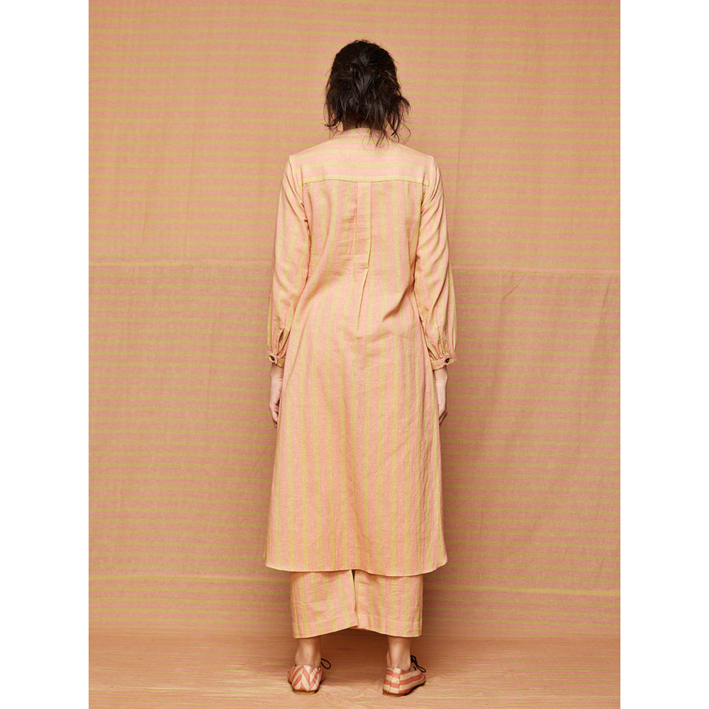Description : Wrap yourself in elegance with this pink kurta by Swati Vijaivargie. Made from high quality linen, it features button fly closure and stripes pattern along with full sleeves & mandarin neck design. Pair it with trendy footwear and minimal jewellery to elevate your look.