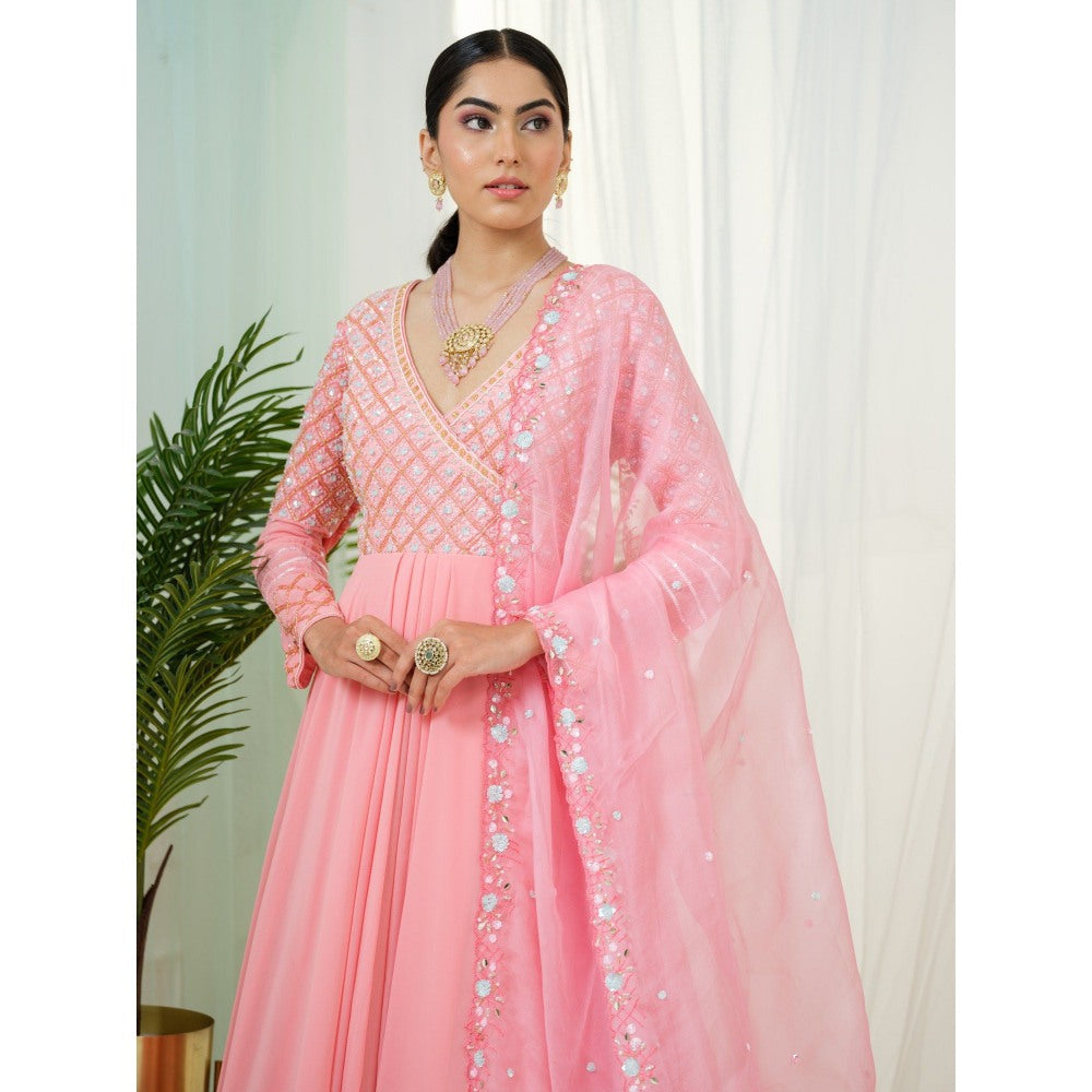 Description : Pink Georgette Anarkali Set Handcrafted In Sequins, Glass beads and Crystals Paired with Organza Floral Cutwork Dupatta