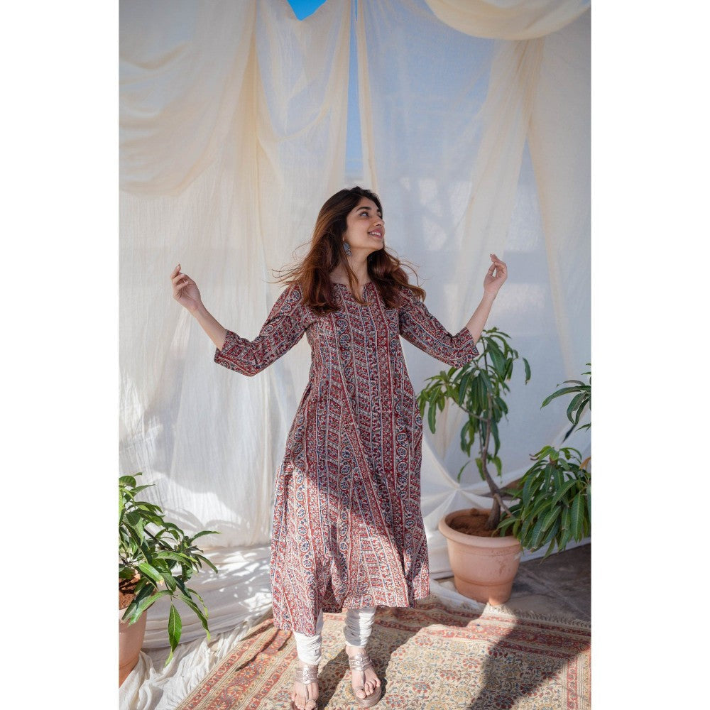 Description : handcrafted kurta in kalamkari hand block printed cotton fabric.this kali kurta is a wardrobe staple and is super versatile.features a split v neck with , full sleeve and made in soft cotton.