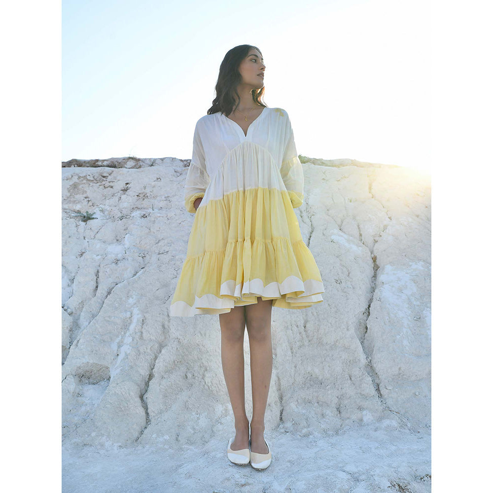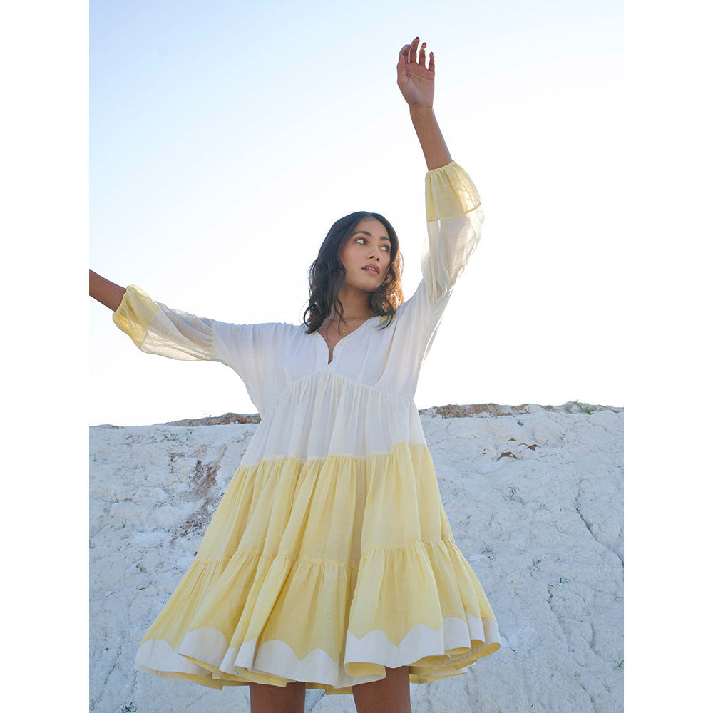 Description : It s a happy summer three- tier dress made of light weight & supremely soft chanderi silk. It has appliqued sea waves baking at the bottom with plunging neckline and two pockets on the side.it s an above knee dual color dress made in vanilla yellow & pearl white colors with drop down balloon sleeves and hand embroidered flower petal on the bodice.