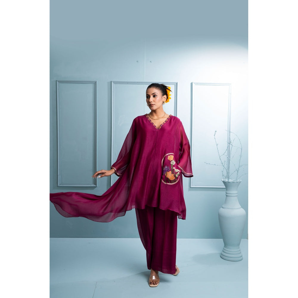 Description : Burgundy Asymmetrical Soft Chanderi Top Features A Flattering V-Neck with An Embroidered Border On The Neckline and Sleeves. The Voluminous Asymmetrical Cut Cascades Beautifully, Adding A Flowy, Contemporary Flair. The Standout Feature Is The Appliqued Patch Pocket, Inspired By The Delicate Beauty Of Japanese Oriental Florals, Bringing A Unique Touch To The Design. Paired with Matching Mul Chanderi Lower with An Attached Soft Cotton Lining and A Separate Slip.