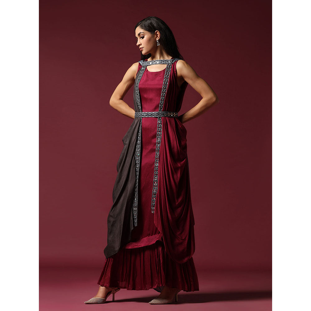 "Two Sisters" by Gyans Maroon and Grey Draped Cape Set with Belt (Set of 3)