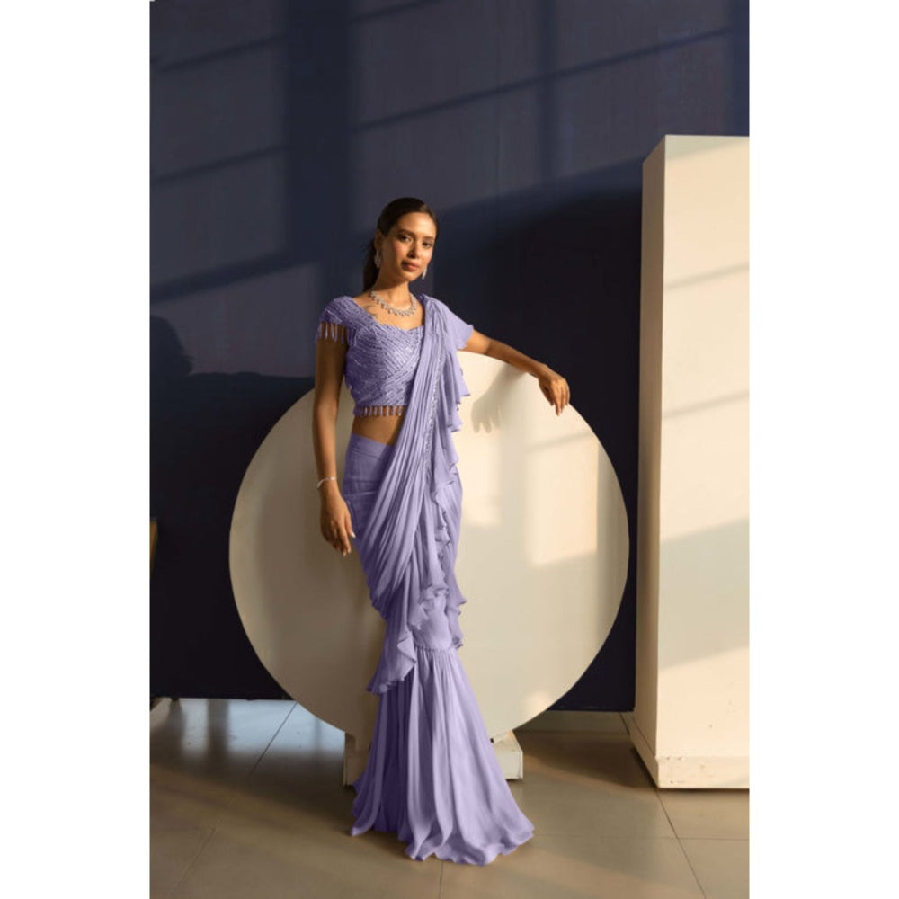 "Two Sisters" by Gyans Purple Georgette Embellished Pre-draped Saree with Stitched Blouse