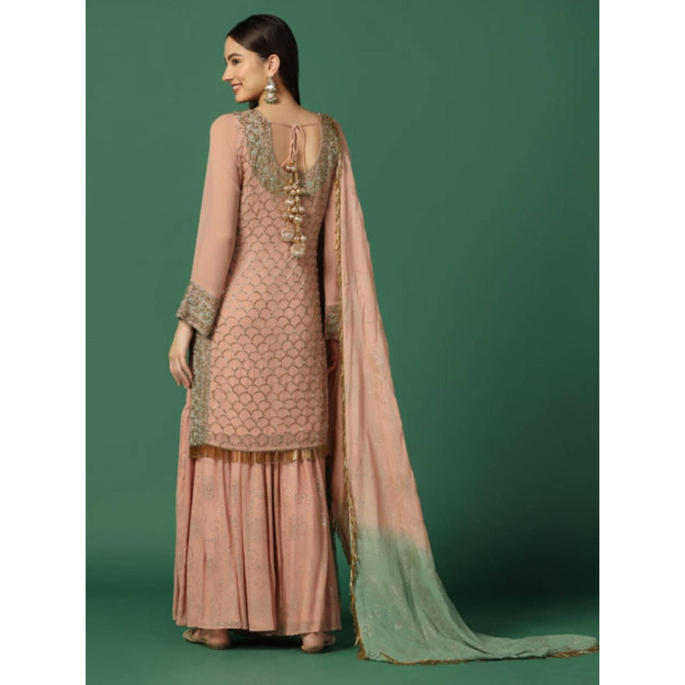 Women Peach Georgette Embroidered Kurti with Sharara and Dupatta