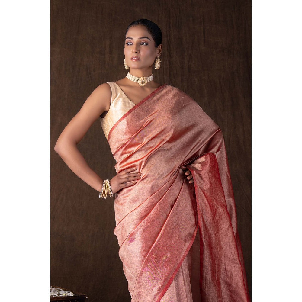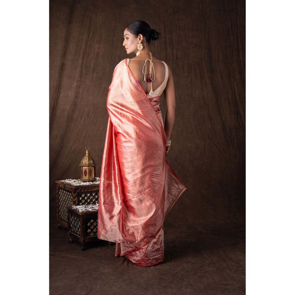 Zal from Benaras Red Pure Tissue Plain Banaras Handloom Saree without Blouse