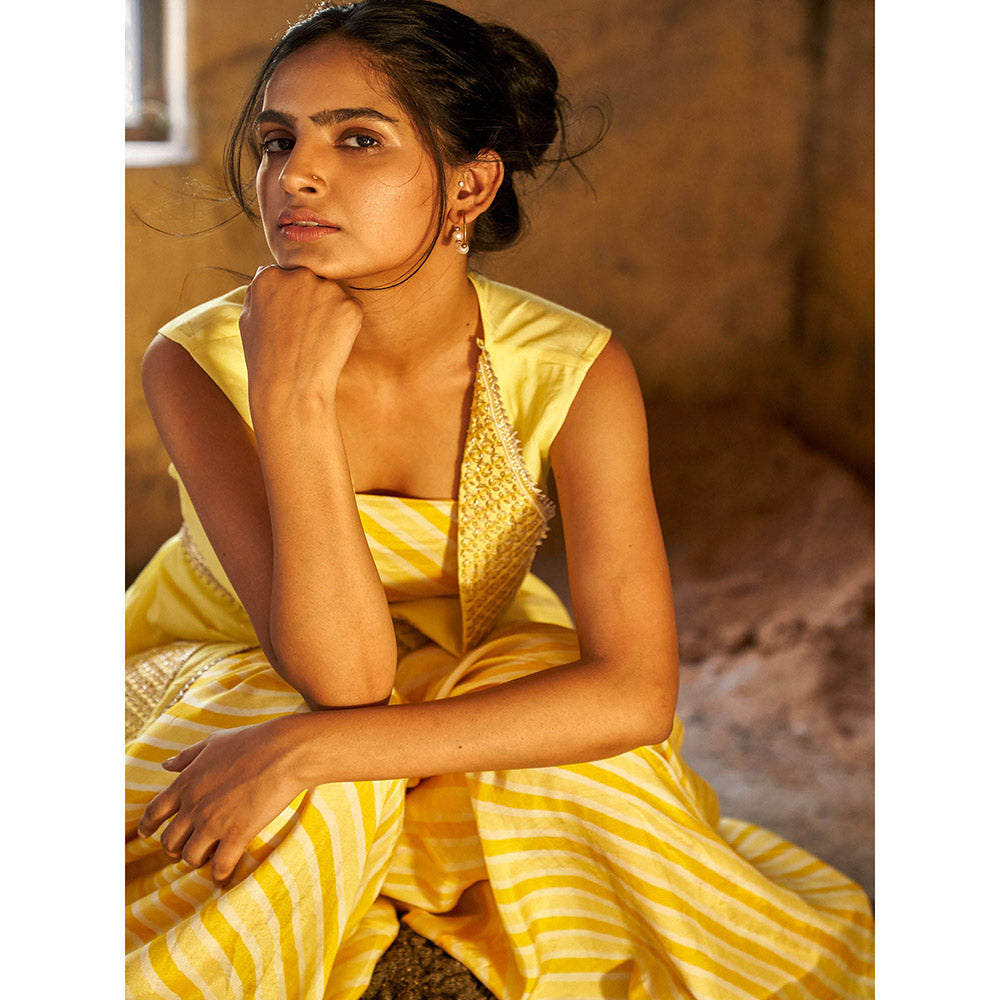 Description : Enhance your style with this fancy yellow co-ord set from 17:17 by Simmi Saboo. Made from high-quality cotton silk, the jumpsuit features a sleeveless design and a shoulder straps. It is paired with a fancy jacket and a stylish belt. Style it with minimal jewellery and sandals to complete the ensemble.