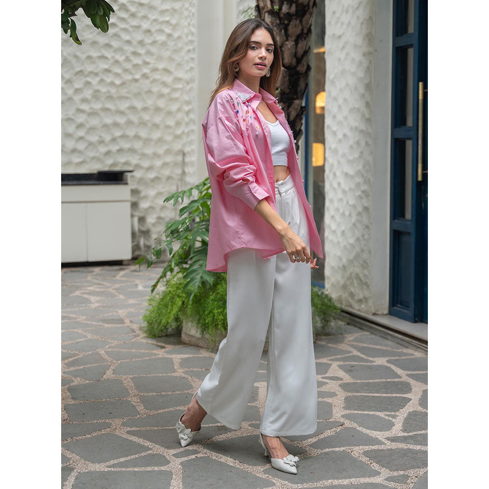 description : Add a playful yet chic vibe to your wardrobe with this aeoy pink oversized shirt for women, featuring colourful bead embellishments across the front and a beads-detailed collar for a trendy twist. Designed in a relaxed fit with full sleeves, it's perfect for casual outings, brunches, and office chic looks. Pair it with trousers, jeans, or skirts for a trendy statement.