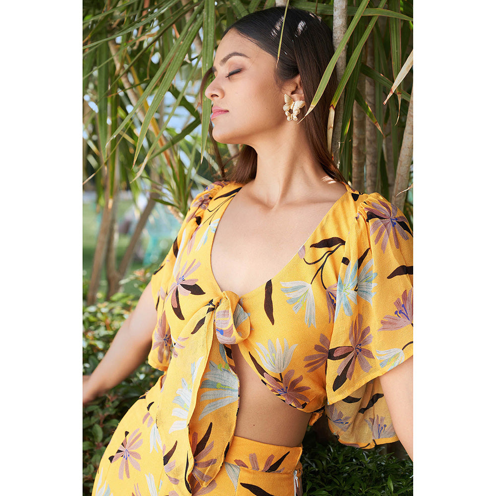 Description : Mustard Color Printed Co Ord Set Featuring Tie Up Detailed Top with Bell Sleeves and Flared Sharara.