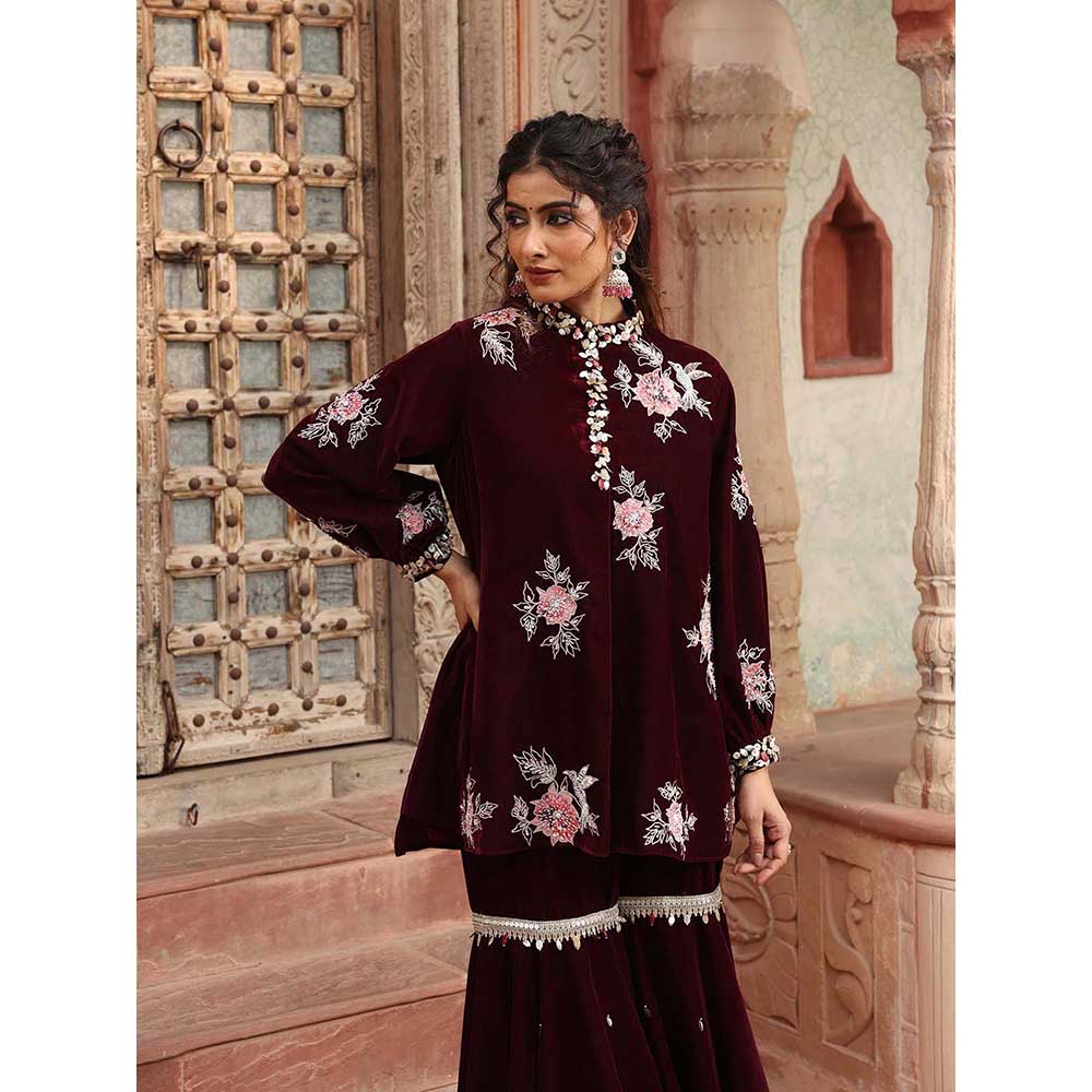 Ajiesh Oberoi Wine Peplum Top with Sharara (Set of 2)