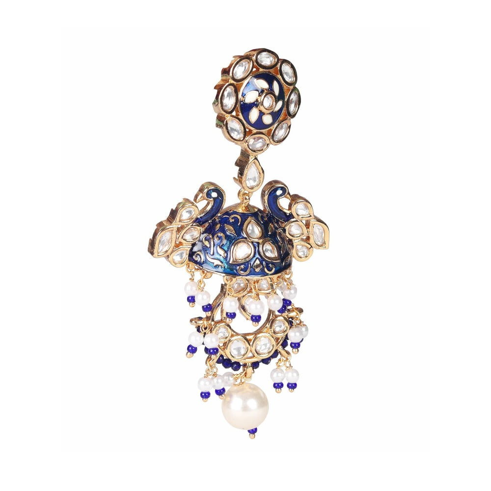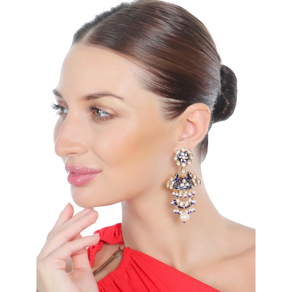 Description : Dark green minakari kundan danglers with delicate white beads.Earrings : Width 1.8" x Height 3.5"Exquisite dark blue minakari kundan danglers embellished with delicate white beads, creating a striking contrast and adding a touch of elegance to your look. These earrings are a perfect choice to enhance your ethnic outfits and make a statement at any special occasion or event.