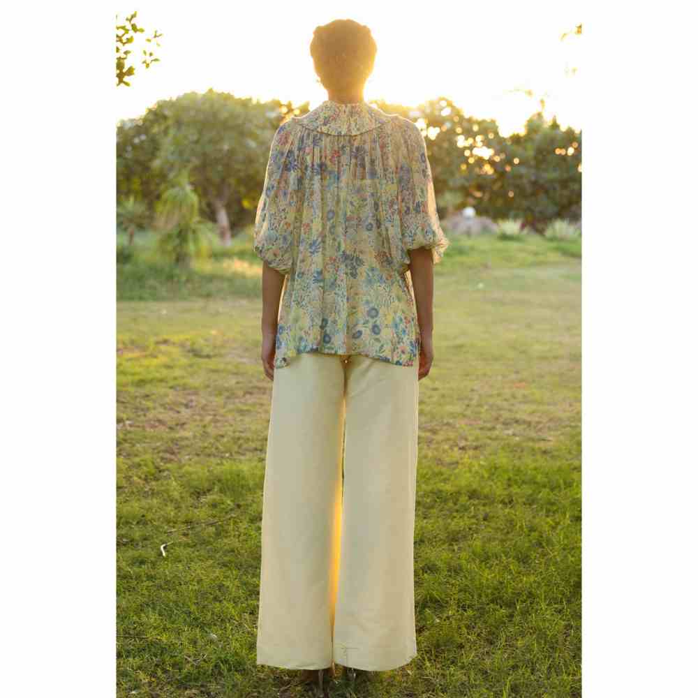 Eliva is a printed chiffon loose fitted top with a ruched detailing going across shoulder and back. Twisted cords are attached at front with rivets fot tie up and the 3/4th sleeves which are puffed and elasticated at hem. The top comes with a matching yellow slip.