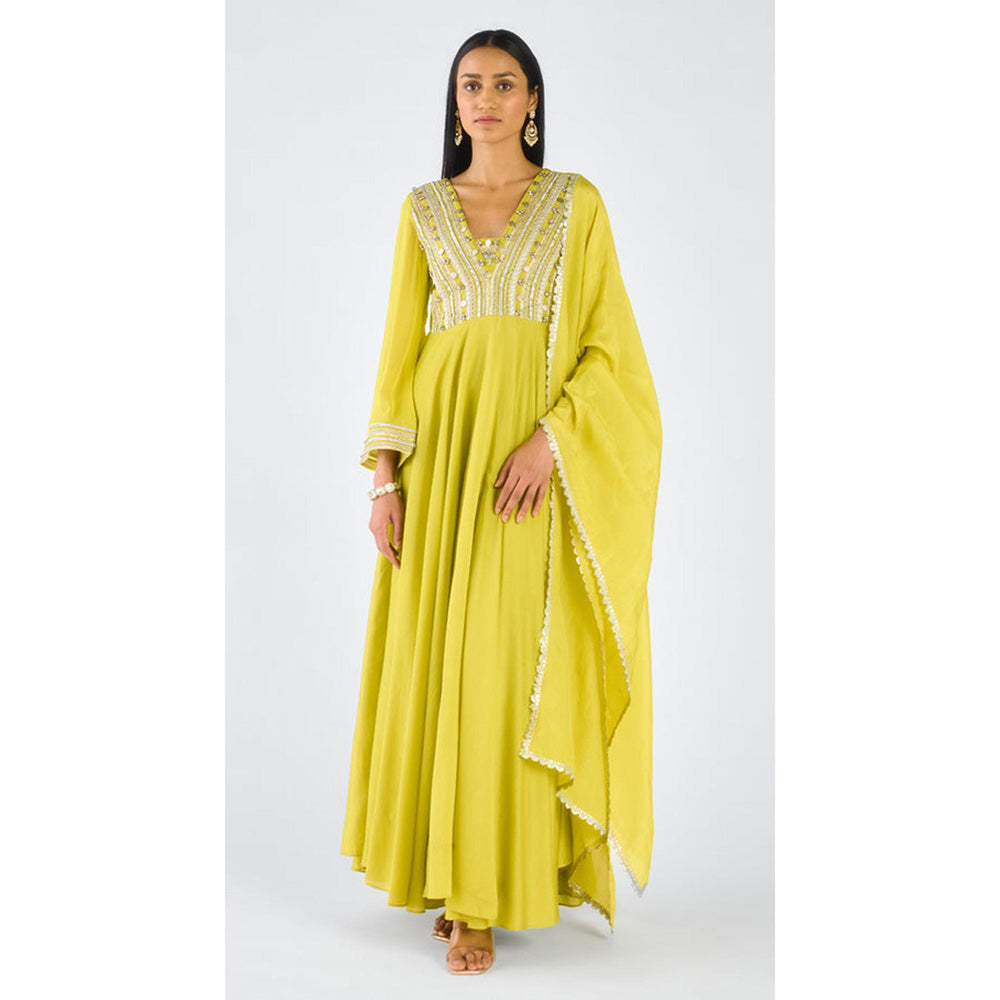 Lime Chanderi Embroidered Anarkali Kurta With Pant And Dupatta