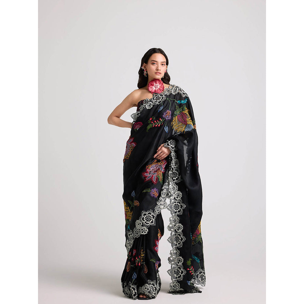 Description : Black Silk Organza Threadwork, Beadwork And Cutwork Saree with unstitched blouse