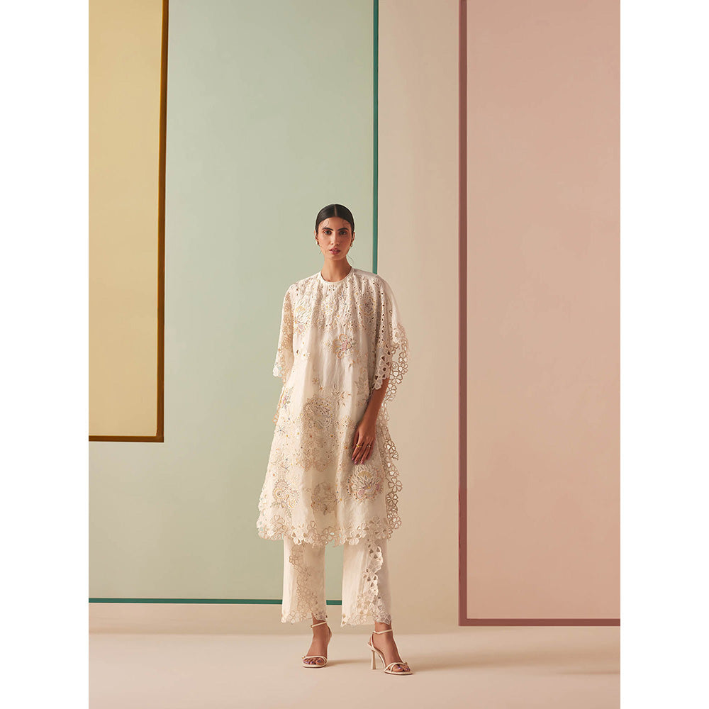 CHANDRIMA Ivory Organza Floral Flared Sleeves Round Neck Bead Work Kaftan