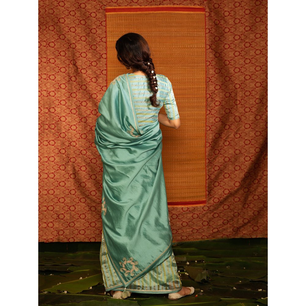 DEEPTHEE Turquoise Half And Half Hand Embellished Saree with Stitched Blouse