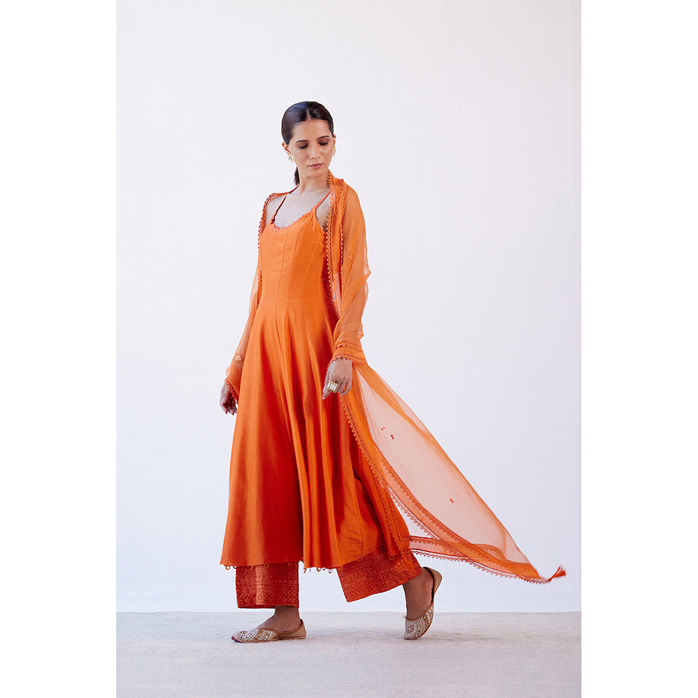 Orange Sleeveless Chanderi Anarkali (Set of 3)