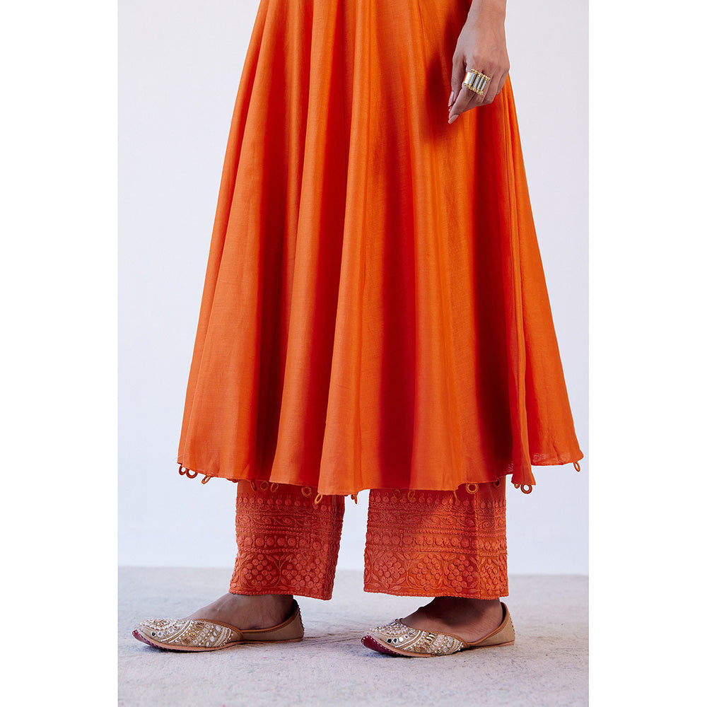 Description : The orange anarkali set features chanderi base with intricate thread embroidery on the neckline. It is paired with a straight palazzo detailed with heavy embroidery on its hemline and a four sided embroidered organza dupatta.