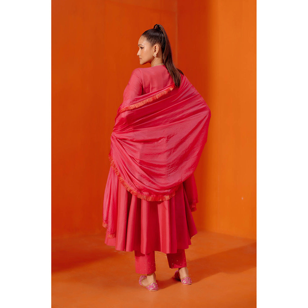 Rani Pink Angrakha Style Embroidered Anarkali (Set of 3)