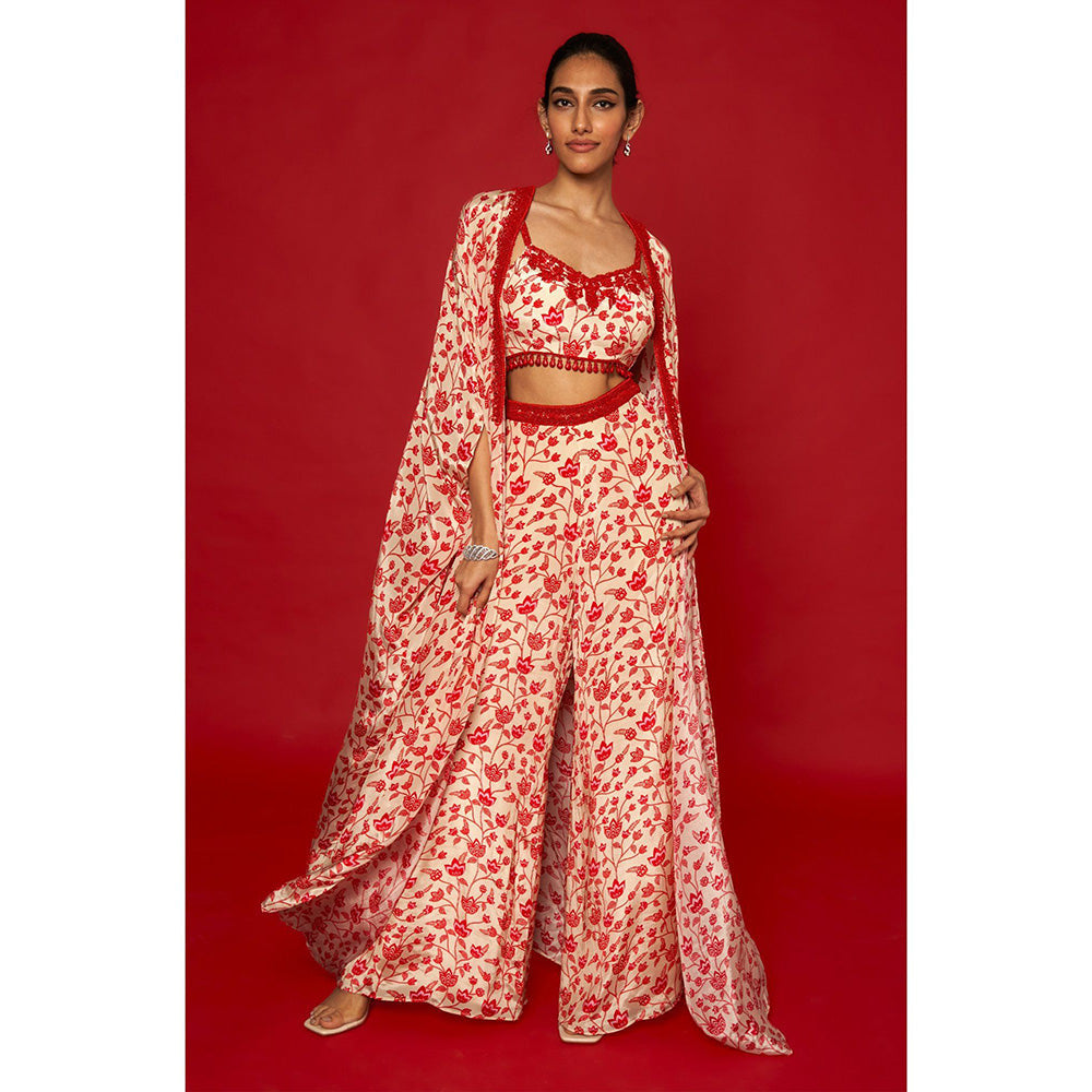 Essay by Sumedha Agrawal Cream & Red Blouse with Palazzo and Cape (Set of 3)