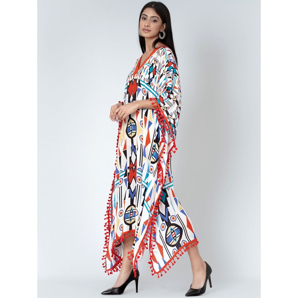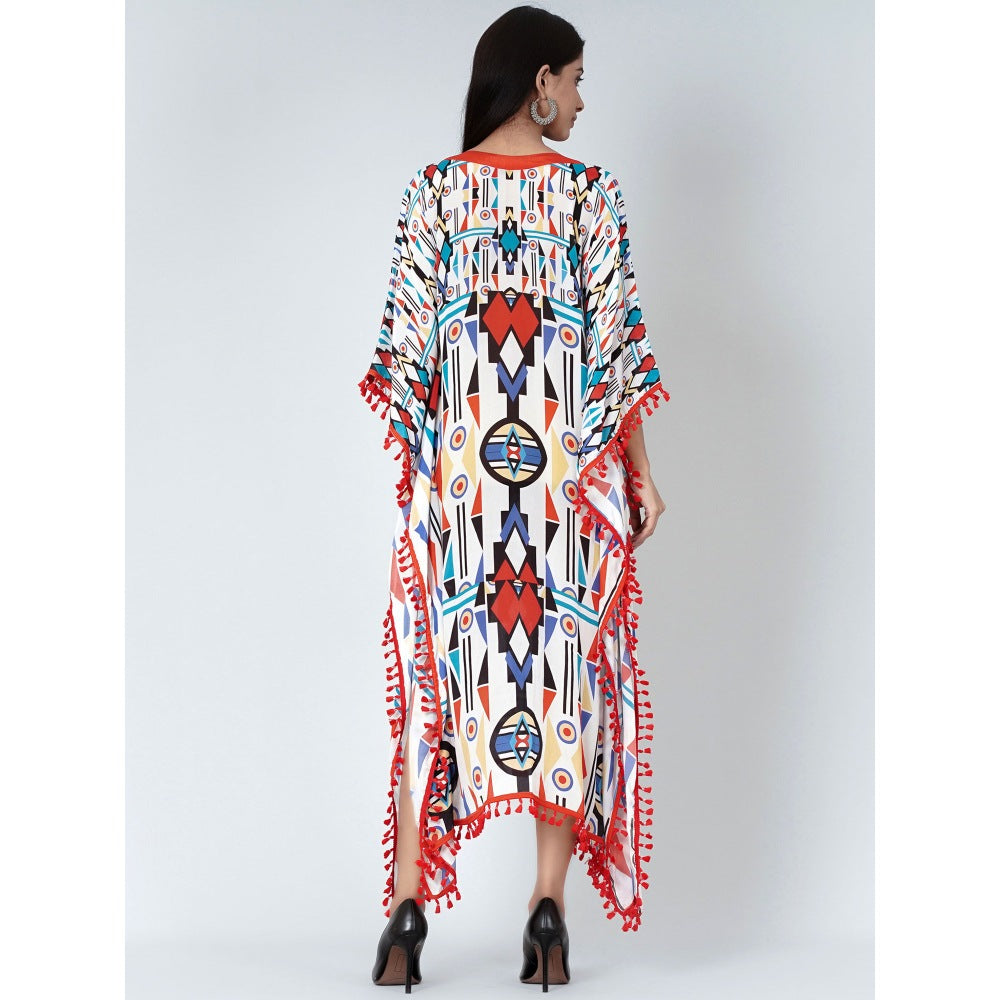 Description : There's nothing more fun than a modern geometric print. Add this white and orange mid length kaftan to your wardrobe enhanced with lace all around the hem.