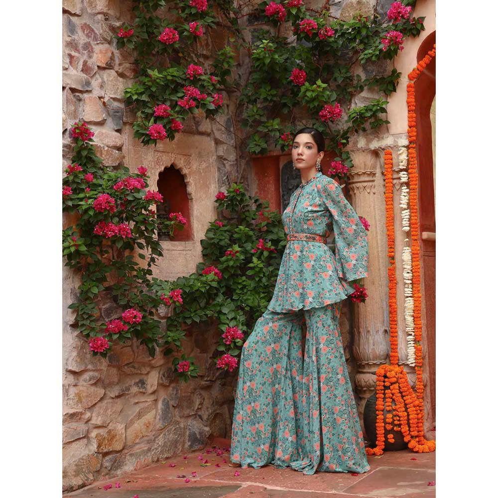 Gazab By Miku Kumar Green Peony Sharara with Top and Belt (Set of 3)