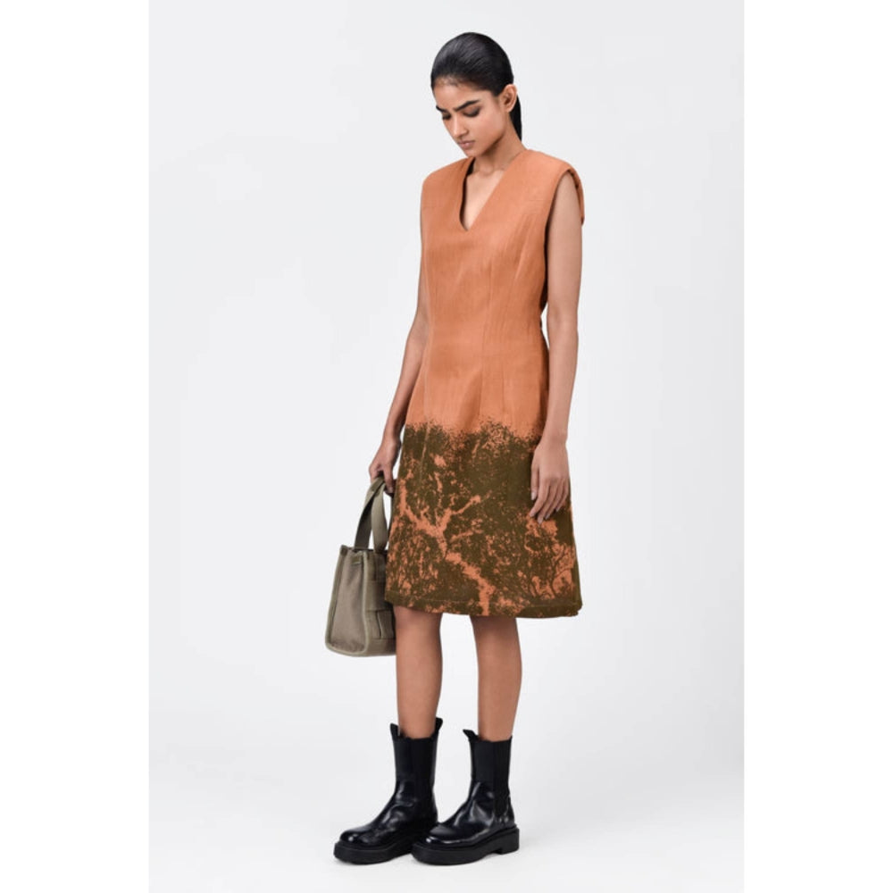 This Salmon Pink Dress, Crafted From Light Linen Herringbone, Features A Slim Fit, V-Neck, Sleeveless Design, And Uneven Dart Placement On The Waist With A Stylish Canopy Print.