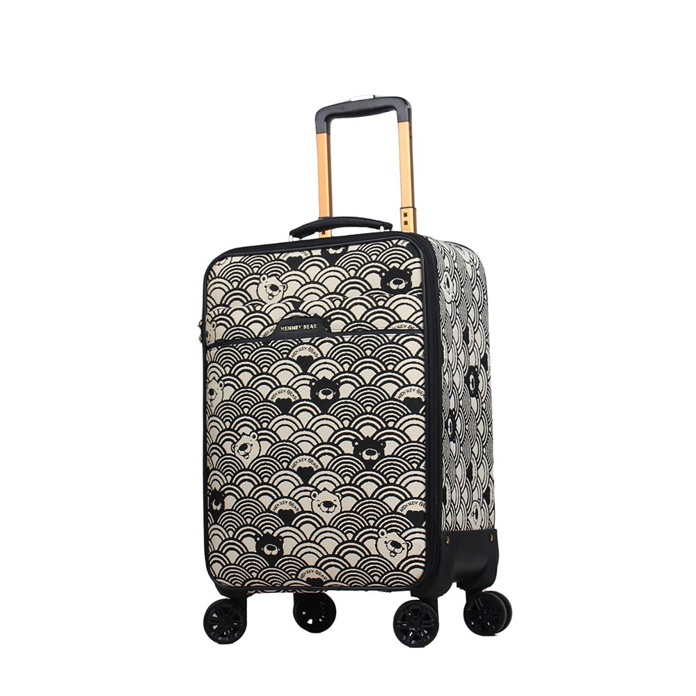 Description : Elegant, lightweight and durable henney bear luggage comes with a sturdy build. For 1-5 days trip, this bag is an ideal selection for travel in style. 100% non-animal materials tsa lock high-quality vegan leather premium quality stitching keeps the luggage sturdy signature zippers and locks aesthetic build stable top handle for easy grabbing 4-way dual spinner wheel noise-minimizing and shock-absorbent wheels high quality wheels help the luggage to be effortlessly carried across all types of surfaces. Reinforced aluminium alloy material trendy and stylish international design additional information :ype : cabin luggage size : height37cm width27cm depth60.5cm handle colour : copper telescopic handle material : aluminium alloy inch : 20 net weight : 3.5 kg carrying capacity : 14 kg outer material : tapestry inner material : polyester leather parts : faux leather exterior features : main compartment with zipper closure two front zipper pockets one top handle 4 way dual spinner wheels interior features: signature lining one main compartment one zipper pocket one plastic pouch one slide-in laptop pocket