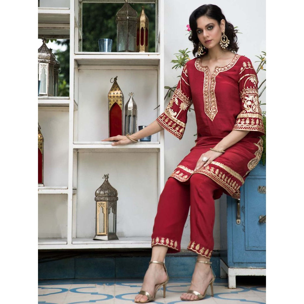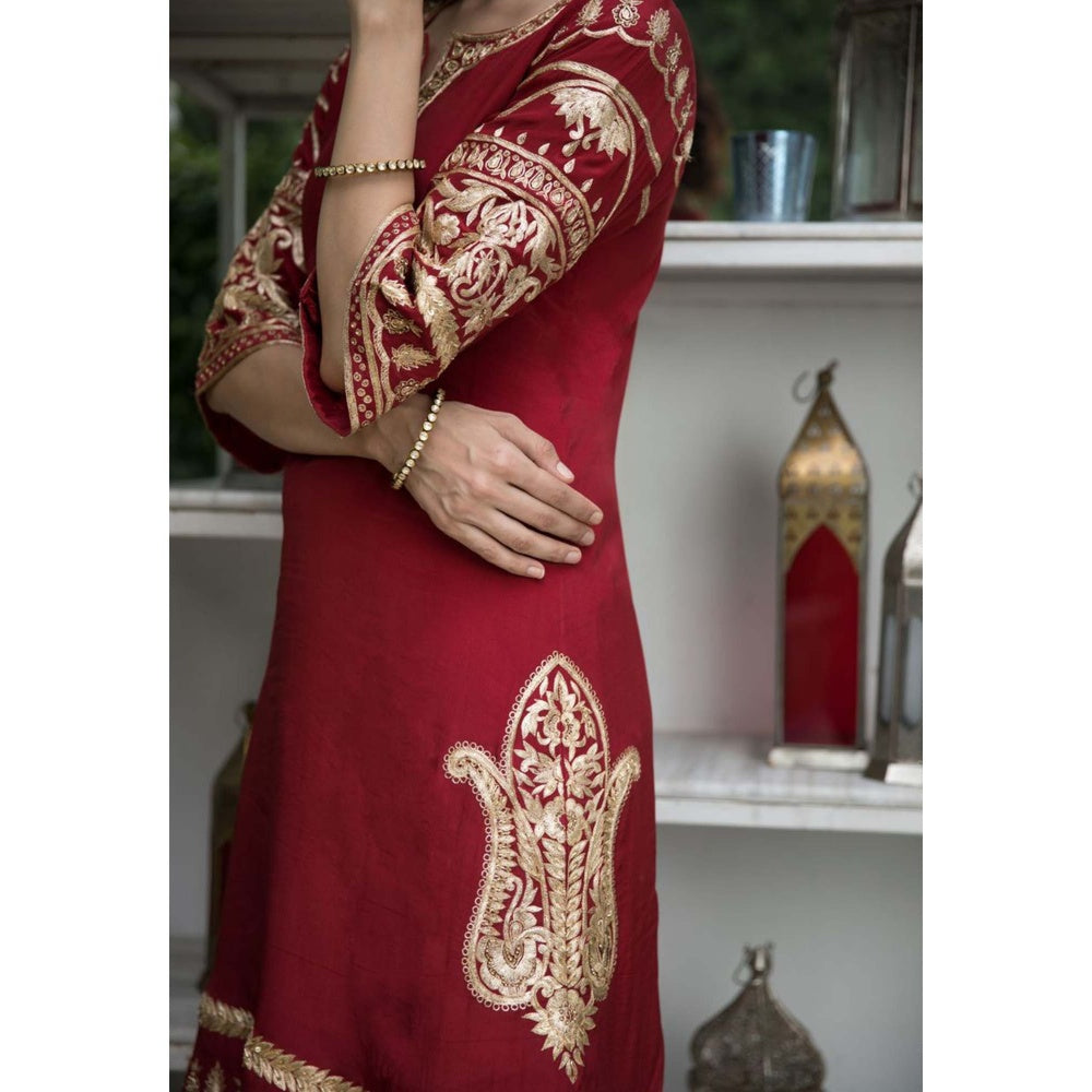 Description : Cherry red slightly a-lined kurta with heavily embroidered sleeves and neck and paisleys on the side.