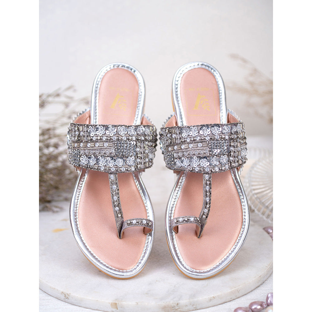 Description : Our Mahnoor Kolhapuri Flats in grey silver base are the ultimate statement for the sunny season. Featuring a captivating geometric pattern adorned with sequins, dabka embroidery, and shimmering crystals, these flats will make your feet sparkle with style and elegance throughout summer.