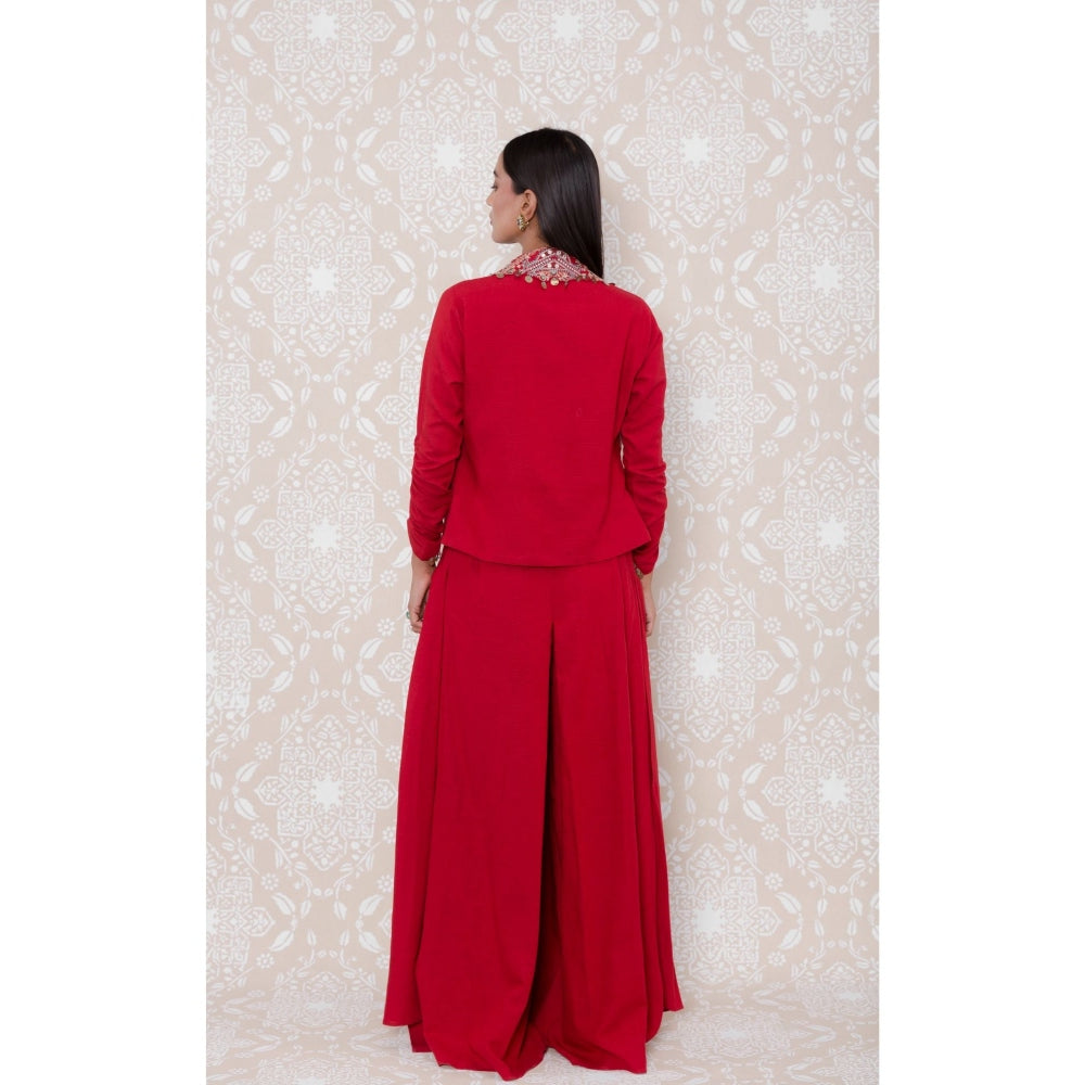 Description : This relaxed fit suit has embroidery on it's collar and side front. sleeves have gathers and embellishments. paired with flared highways pants and a bustier