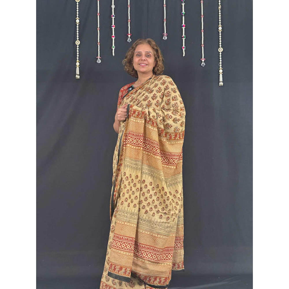 Womens Block Print Beige Pre-Draped Saree With Unstitched Blouse