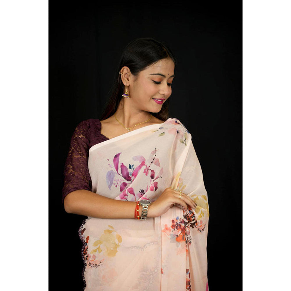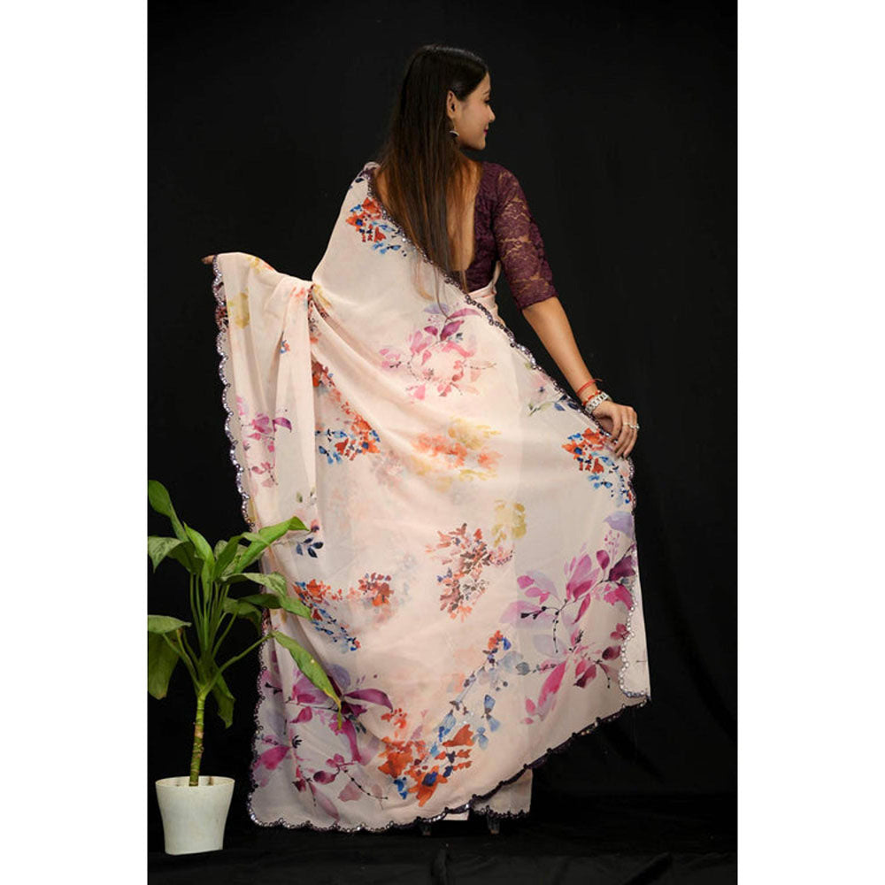 Womens Floral Mirror Work Peach Pre-Draped Saree With Unstitched Blouse