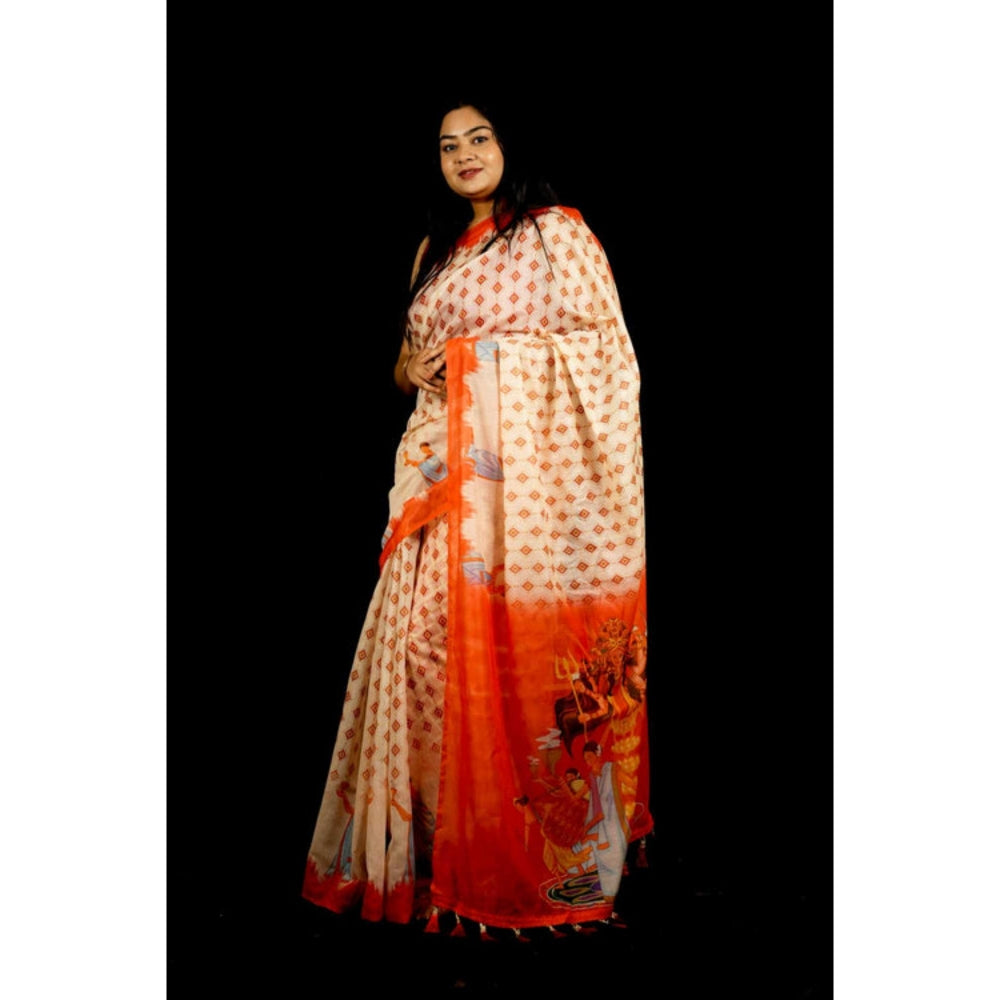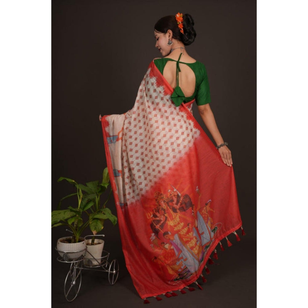 Isadora Life Womens Printed Tassels Cream Pre-Draped Saree With Unstitched Blouse
