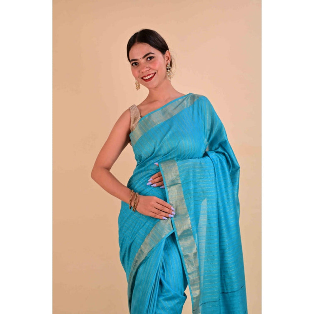Womens Stripes Zari Blue Pre-Draped Saree With Unstitched Blouse
