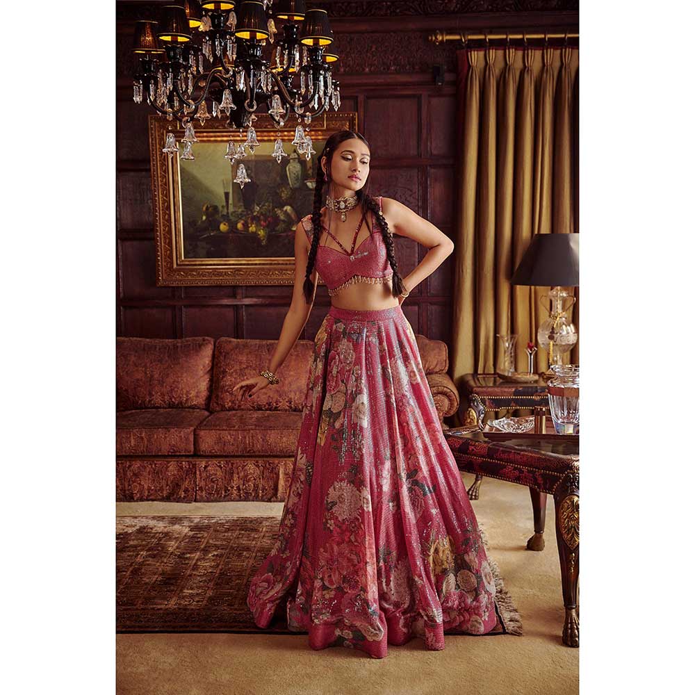 Description : FEATURING A HAND PAINTED AND PRINTED LEHENGA WITH OVERALL SEQUIN DETAILING, PAIRED WITH AN INTRICATELY SEQUINED BLOUSE WITH GLORIFIED TASSLES. FABRIC: VISCOSE GEORGETTE COLOUR: CRIMSON PINK NO. OF COMPONENTS: 2 BLOUSE LENGTH: 14.5"-15"SKIRT LENGTH: 44"