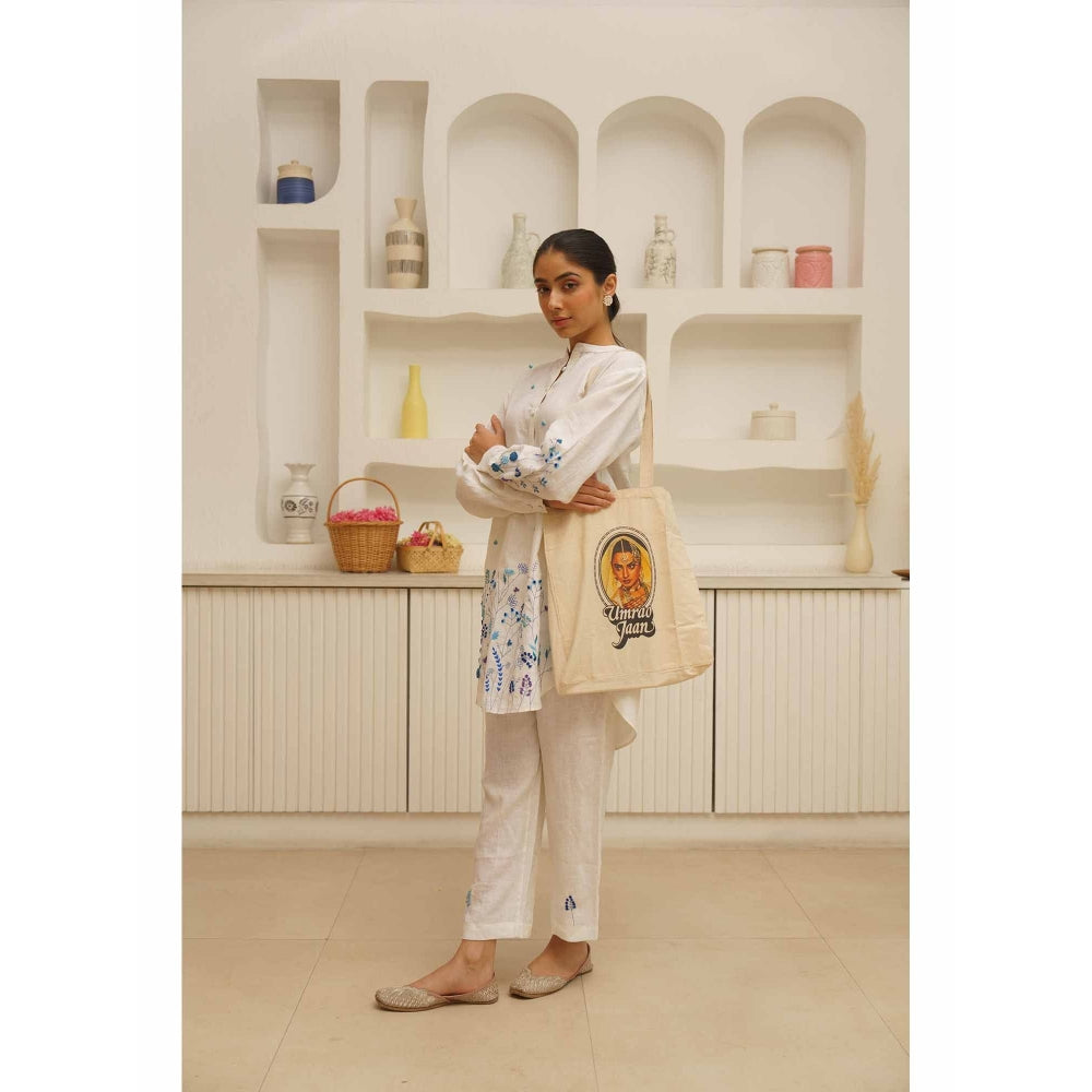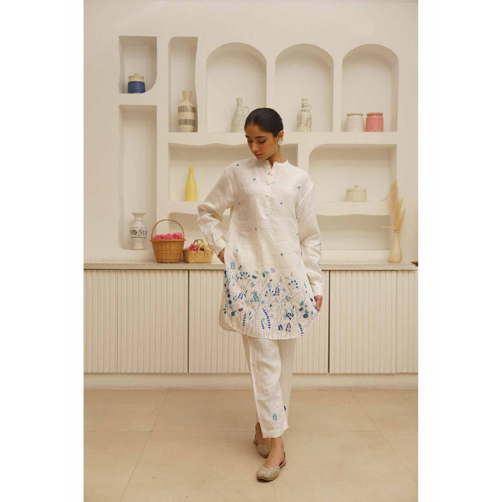 Description : Introducing Our Sophisticated White Shirt Style Kurta, Adorned With Intricate Blue Embroidery . Crafted With Attention To Detail, This Kurta Exudes Style And Charm, Perfect For Elevating Your Ensemble. Embrace The Classic Blue Hue And Make A Stylish Statement With This Versatile Wardrobe Essential. Crafted In Luxurious Linen. Embroidery Placement-Spread Out With Floral Embroidery. Kurta Length Is 34 Inches. Pants Length Is 37 Inches.