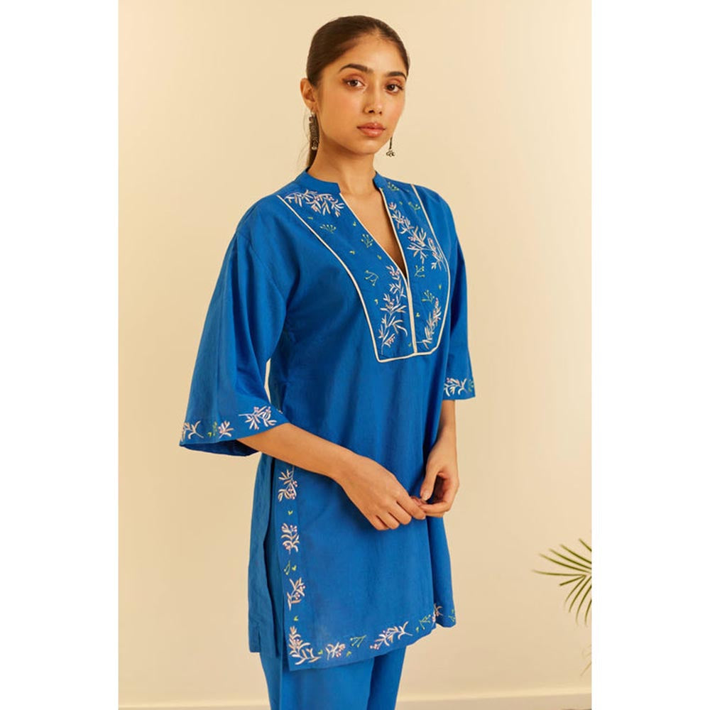 Embrace timeless elegance with our blue cotton kurta set. A straight-fit short kurta boasts 3/4th sleeves, a V-neck with mandarin collar, and exquisite hand embroidery on the yoke and hems. The flared pants, adorned with embroidered slits, are your passport to office panache and smart soirees.