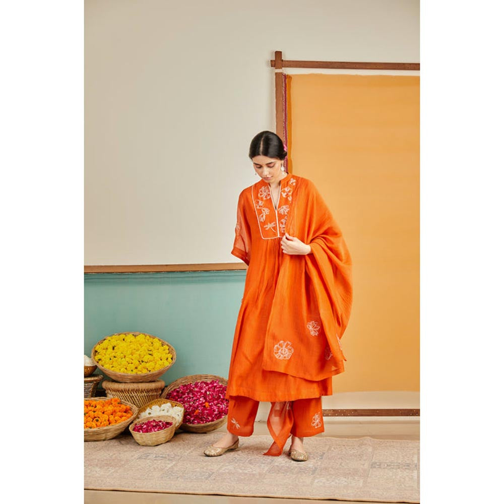 Our Deep Orange Chanderi Kurta features a V neckline with a mandarin collar. Adorned with hand-embroidered florals, delicately crafted with silver zari, both on the yoke and 3/4th sleeves, this ensemble is a work of art. It is paired with pants featuring floral motifs embroidered along the edge.