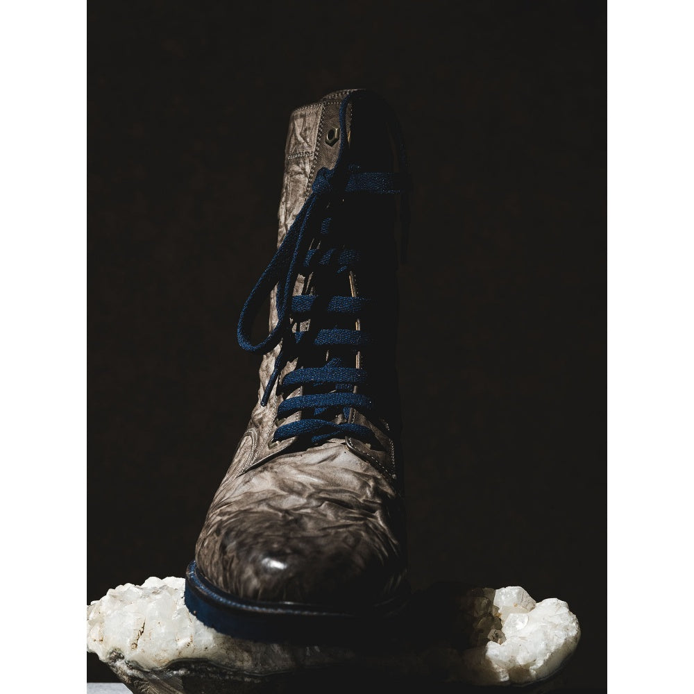 Description : Handmade high-top sneakers crafted in grey crinkled Italian leather with an earthy appearance. Based on a teal heel with the signature Argentine wooden laser print, the boots are enclosed with thick, teal laces and a back zipper with double seamed outlines along the front. The heel caps are stiffened and the midsole includes wide stitches for a raw, dynamic appearance.