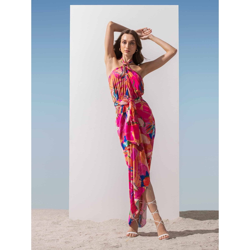 Description : SATIN ABSTRACT PRINTED DRAPED HALTER NECK DRESS WITH WAIST TIE UP DETAIL