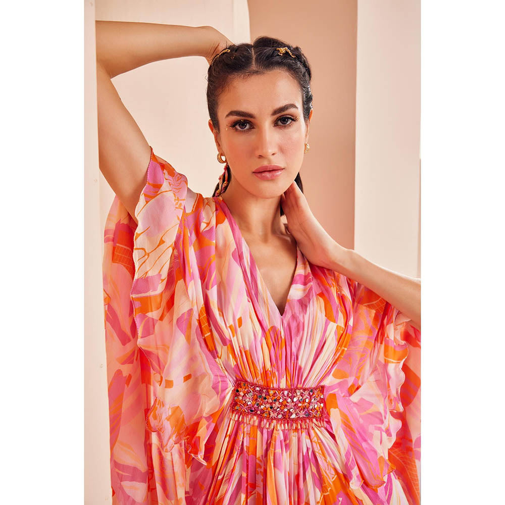 MANDIRA WIRK Front Belt Embroidery Detailed Printed Chiffon Asymmetrical Pleated Kaftan