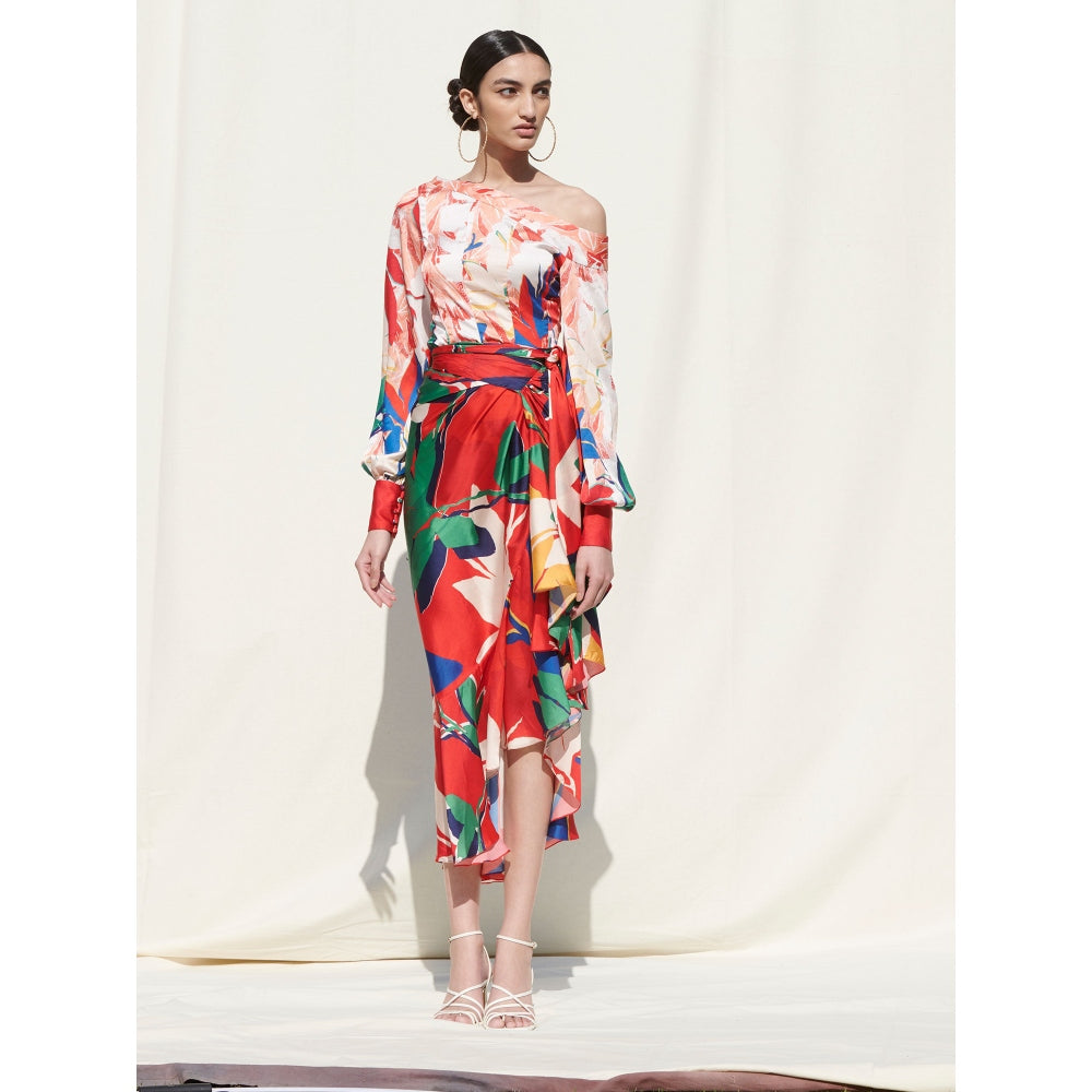Description : Timeless in design, this multi-color skirt set from MANDIRA WIRK is an excellent choice. Perfect to wear on vacations, it is crafted from satin. Club with a pair of sandals and a tote bag while you explore around.