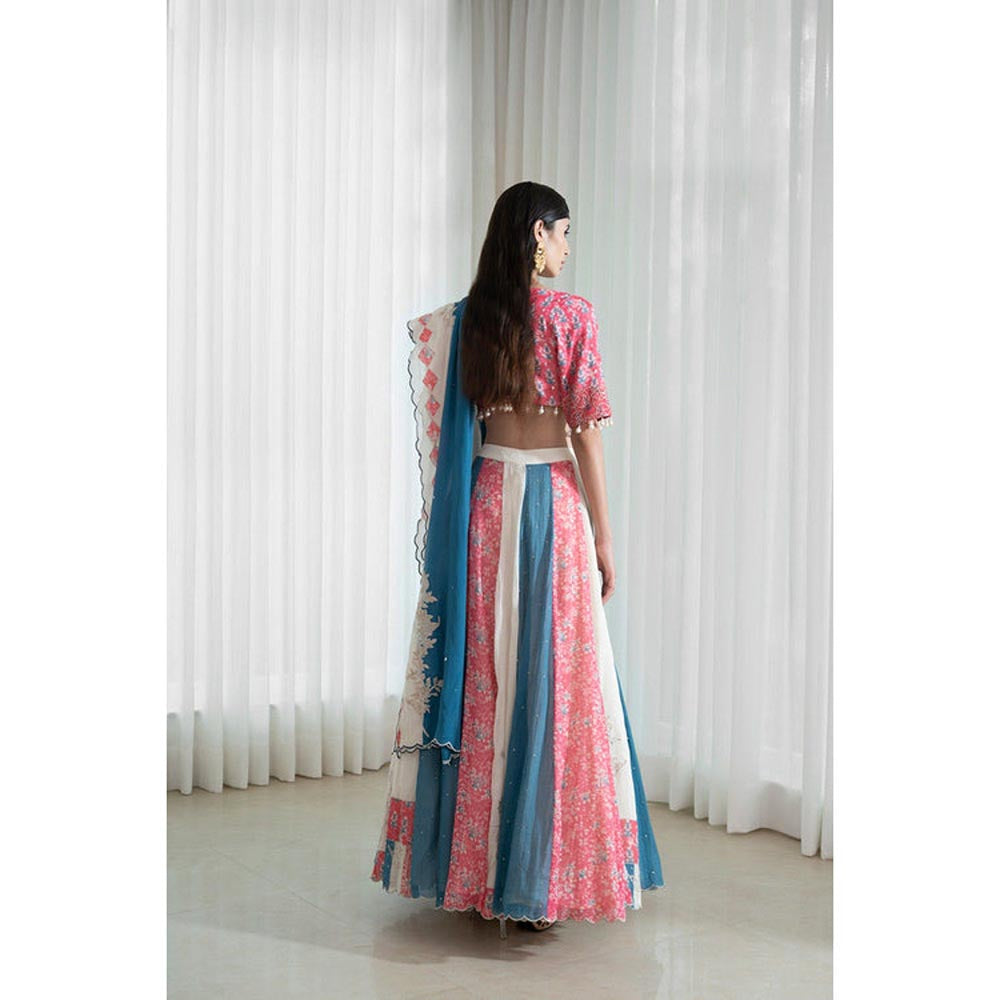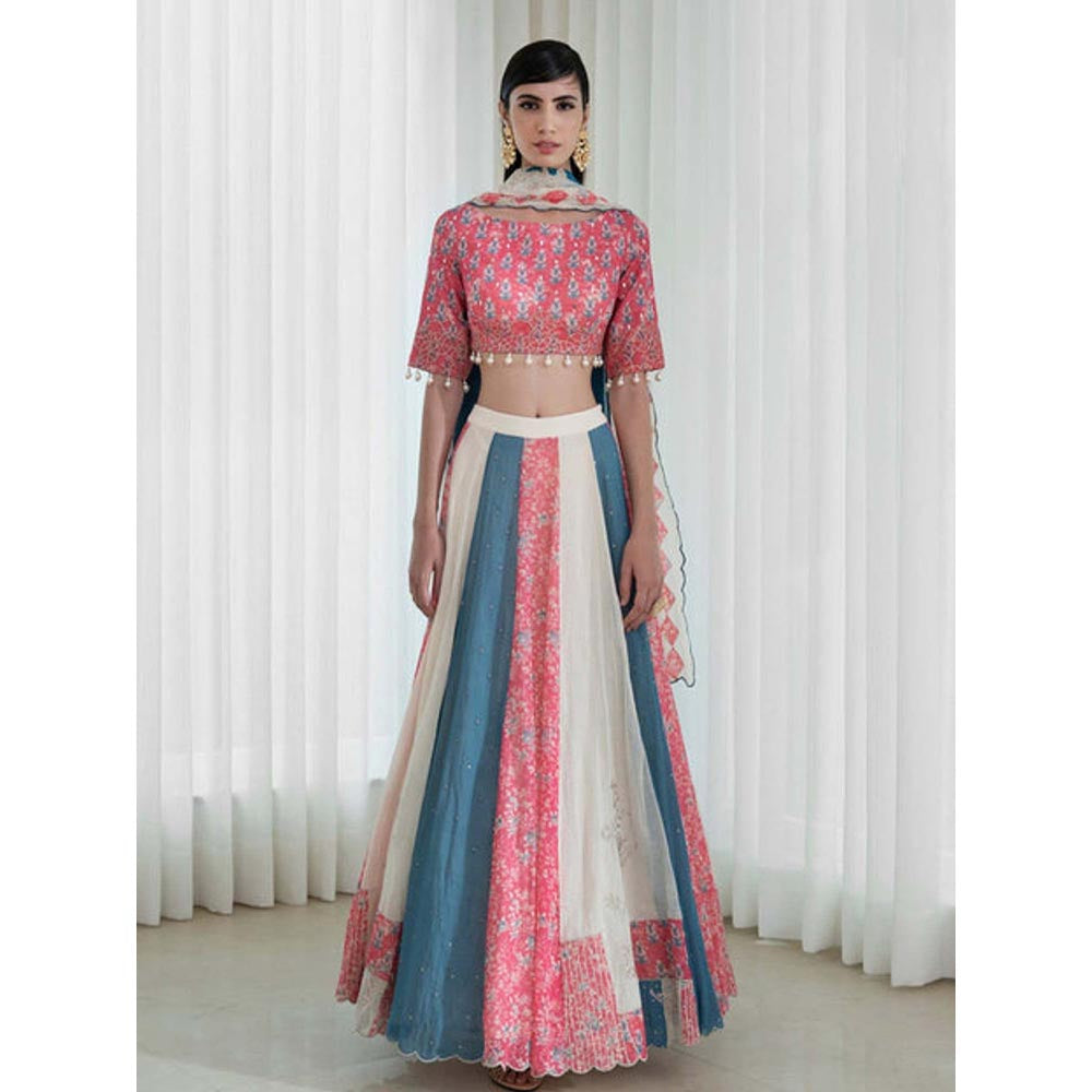 description : Experience effortless style with this multi-color lehenga choli from MANDIRA WIRK. Crafted from chanderi, this alluring set is finished with half sleeves and a round neck. Team it with a pair of heels and statement jewellery.