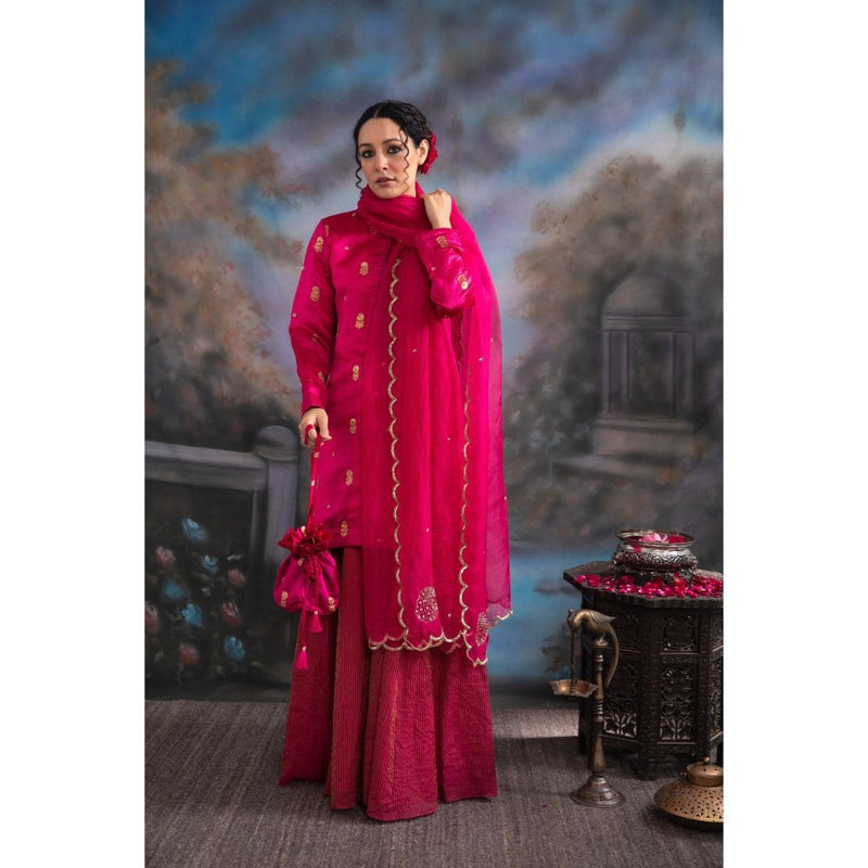 Description : Hand embroidered hot pink pure pattusilk kurta sharara set. Tailored to sartorial perfection from premium quality fabric, it assures a soft and soothing touch against the skin. The exquisite silhouette adds to its appeal.