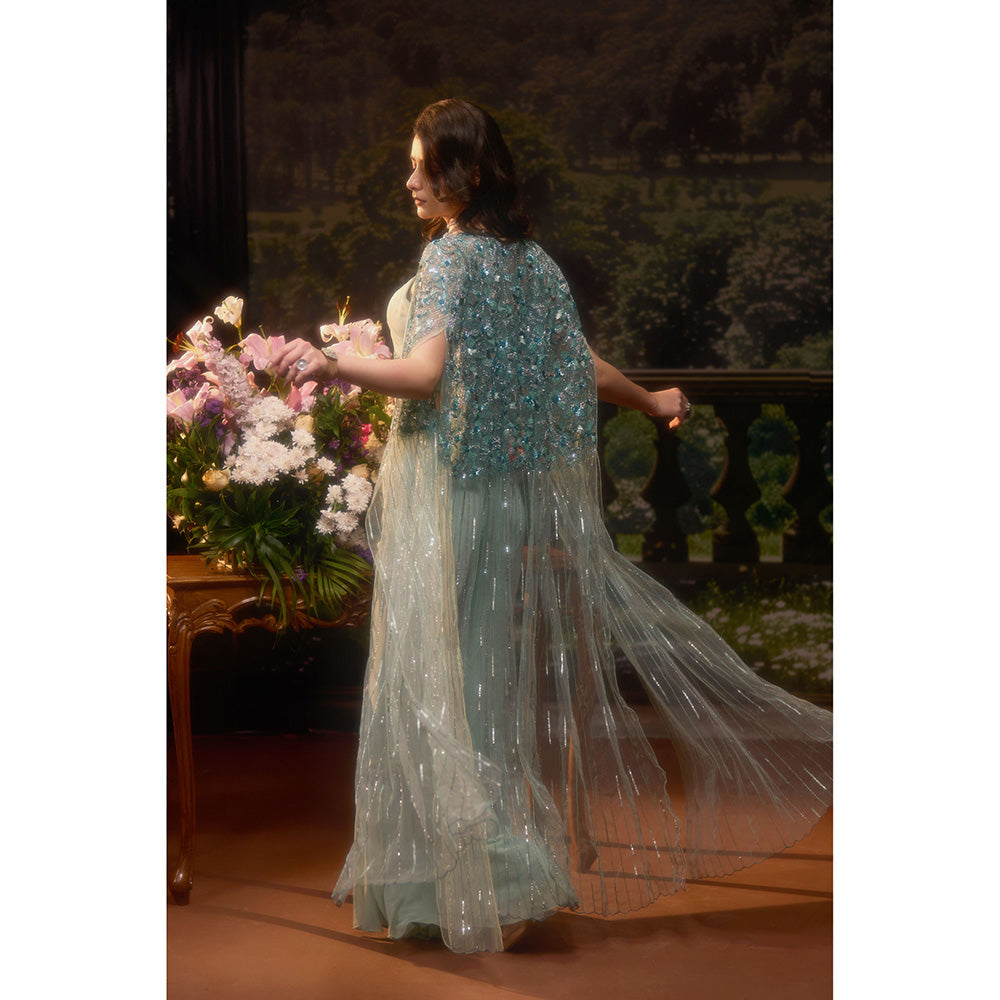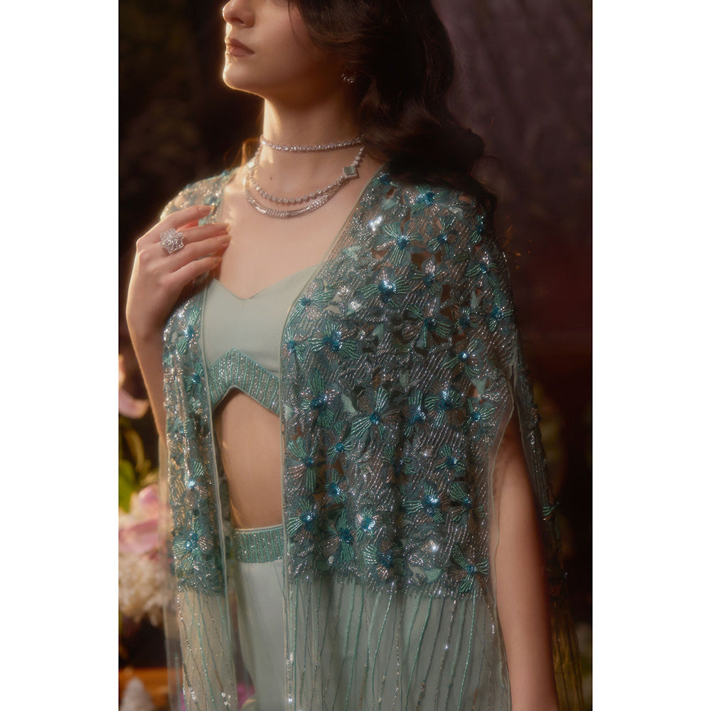 Description : Garner all the attention in this blue co-ord set from Muskan Aggarwal. Crafted from georgette, this alluring set is finished with cape sleeves and a sweetheart neckline. Team this set with a pair of heels and minimal jewellery.