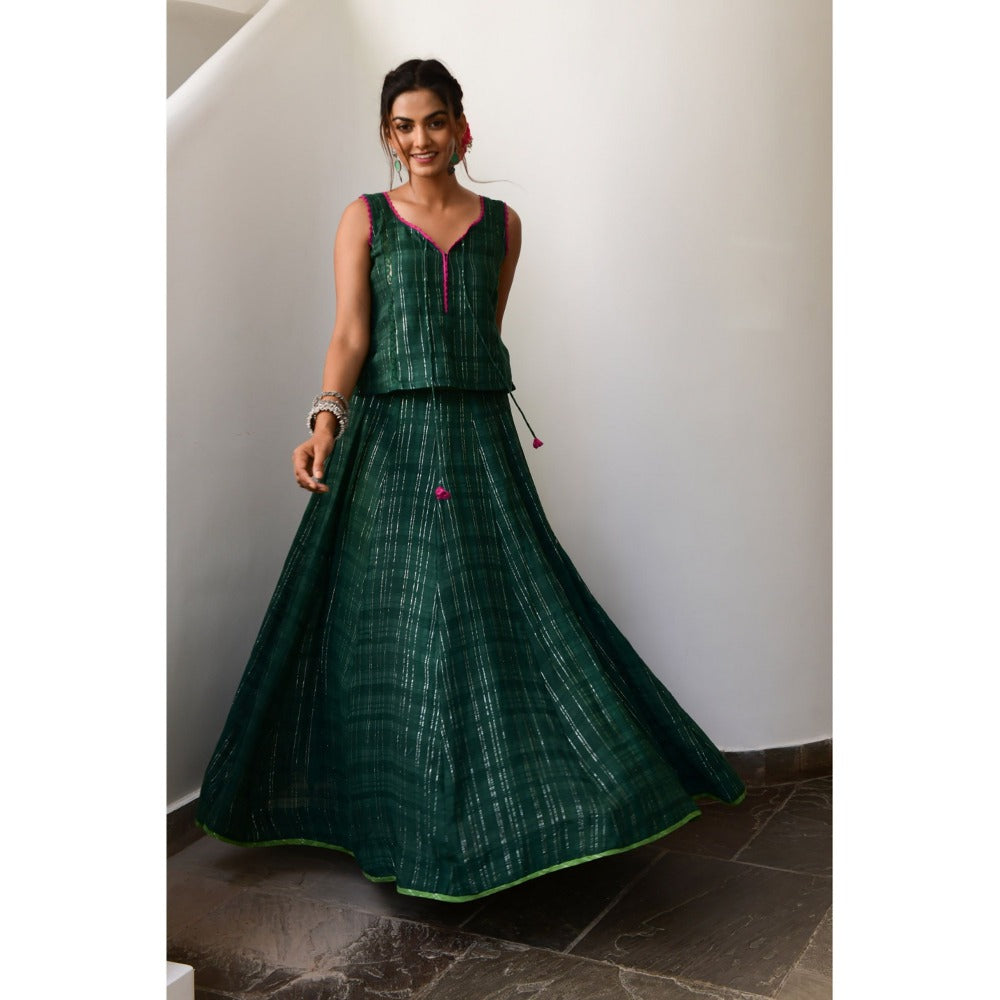 Description : Forest green Indie Skirt-set featuting lace inserts and contrast details - perfect for the festive mood! Flared skirt and top are both beautifully crafted in hand-woven cotton lurex.