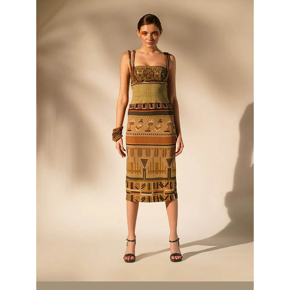 Nikita Mhaisalkar Green Aztec Print Rib Dress with Inner and Wooden Embellishment (Set of 2)