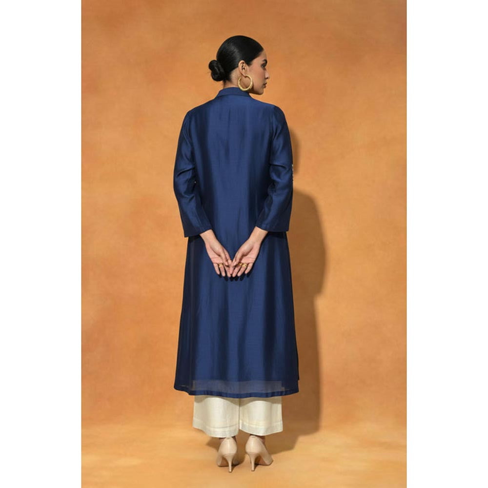Blue and Ivory Chanderi Silk 3 Pcs Set, featuring a Waterfall Resham Embroidered Jacket, a sleek sleeveless Inner Top, and tailored Pants.