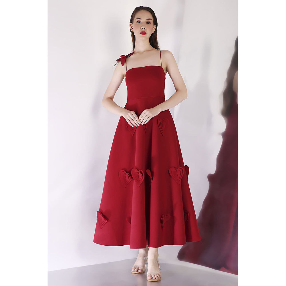 Description : A Mid-Calf Dress Featuring Heart-Shaped 3D Appliqu s For A Solid, Romantic Look, With A Single Shoulder Strap Adorned With A Delicate Flower Motif.